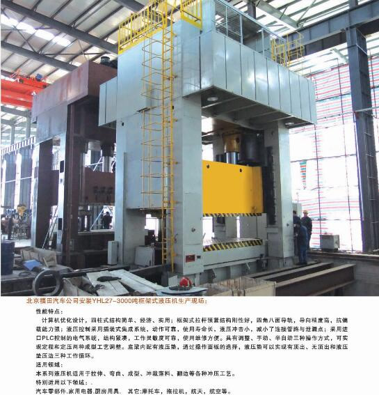 公司能夠?yàn)槭袌?chǎng)提供42大類500余個(gè)品種的標(biāo)準(zhǔn)液壓機(jī)和非標(biāo)專用、精密伺服液壓機(jī)。產(chǎn)品廣泛應(yīng)用于汽車、航天、粉末冶金、船舶、輕工、建筑、電子、家用電器等行業(yè),并代表著我國(guó)通用液壓機(jī)的發(fā)展水平。公司生產(chǎn)、設(shè)計(jì)、開發(fā)的液壓機(jī)產(chǎn)品完全能夠滿足國(guó)內(nèi)不同用戶多層次的需要。